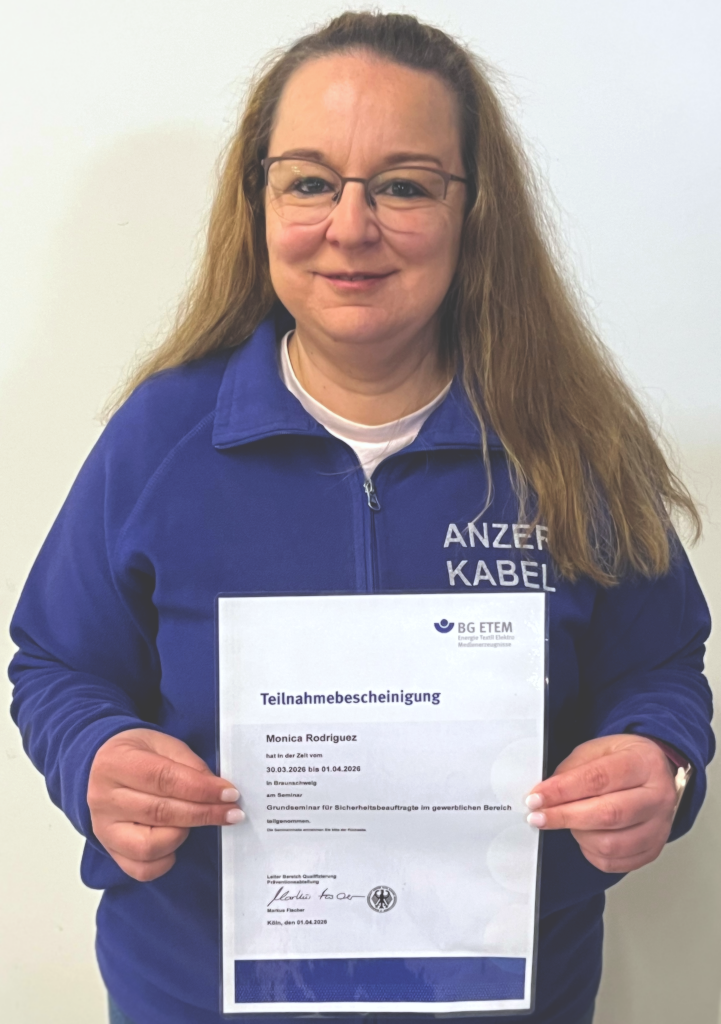 Wir freuen uns, dass Monica diese Verantwortung übernimmt und sich in diesem wichtigen Bereich engagiert. Damit leisten wir gemeinsam einen weiteren Beitrag zu einem sicheren und strukturierten Arbeitsumfeld bei Anzer Kabel.